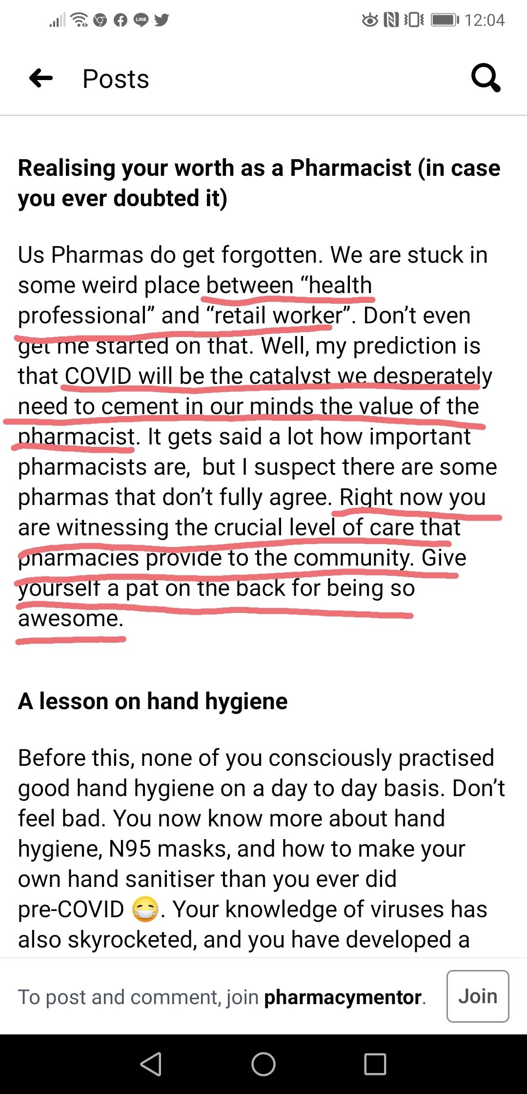 でも、今回のコロナウイルス騒動で、薬剤師の価値というものが、私たちの中に深く刻まれるいい機会になることでしょう。今現在、最前線で働いている中で、薬剤師がコミュニティーに貢献できることの多さや大切さを私たちは目の当たりにしています。背中に手を当てて、「よくやってるね!」と言ってあげましょう!