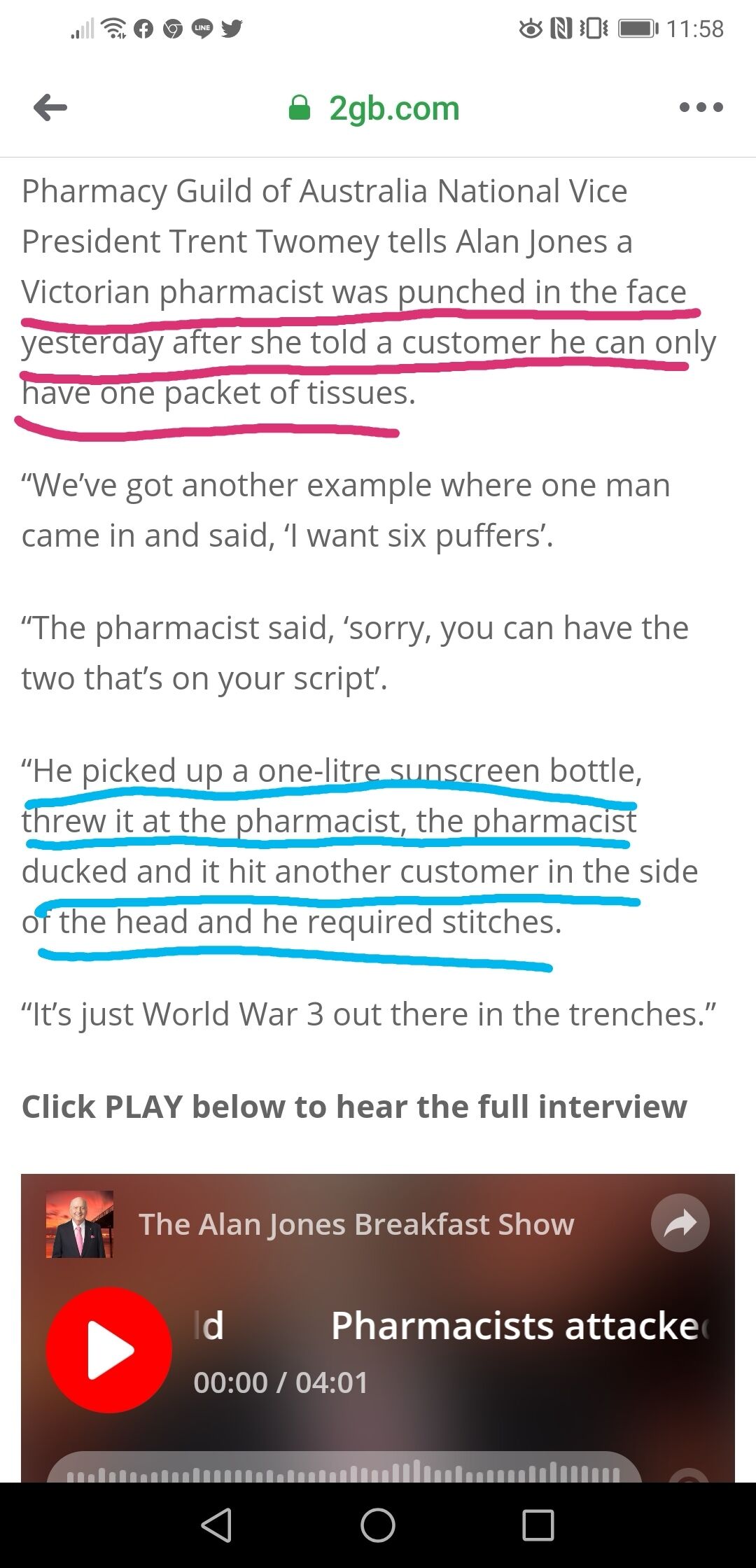 ティッシュを買おうとしていたお客さんに「1箱までです」と薬剤師が告げたところ、顔をパンチされた。