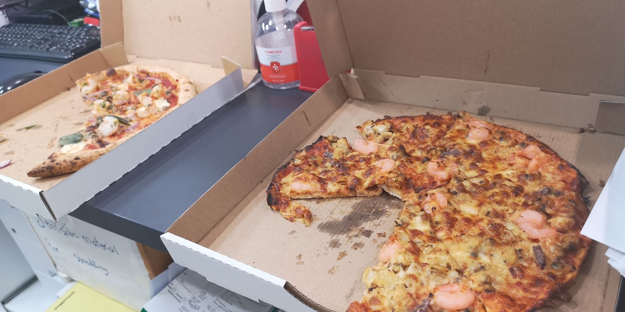 ご飯食べるのを逃したらボスがピザを取ってくれて、立ちながらかなり遅めのお昼を食べた日も。