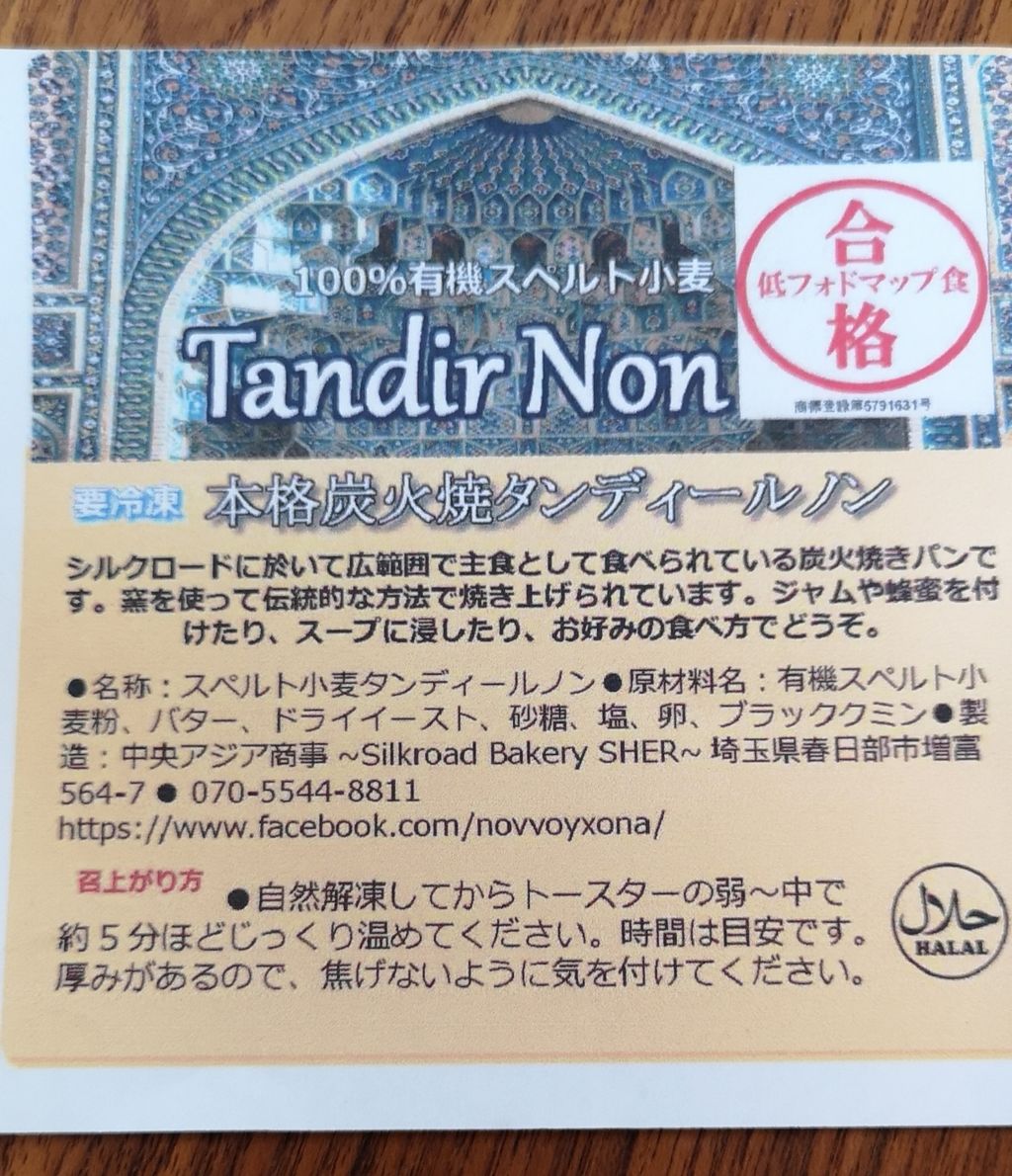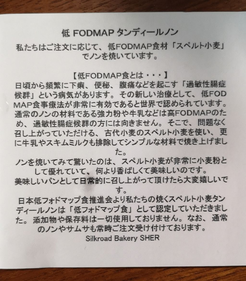 本来は強力粉を使用するノンですが、シルクロードベーカリー シェルさんは低フォドマップにご理解のあるパン屋さん!なんと、注文に応じてスペルト小麦を使用したノンを焼いてくださっています