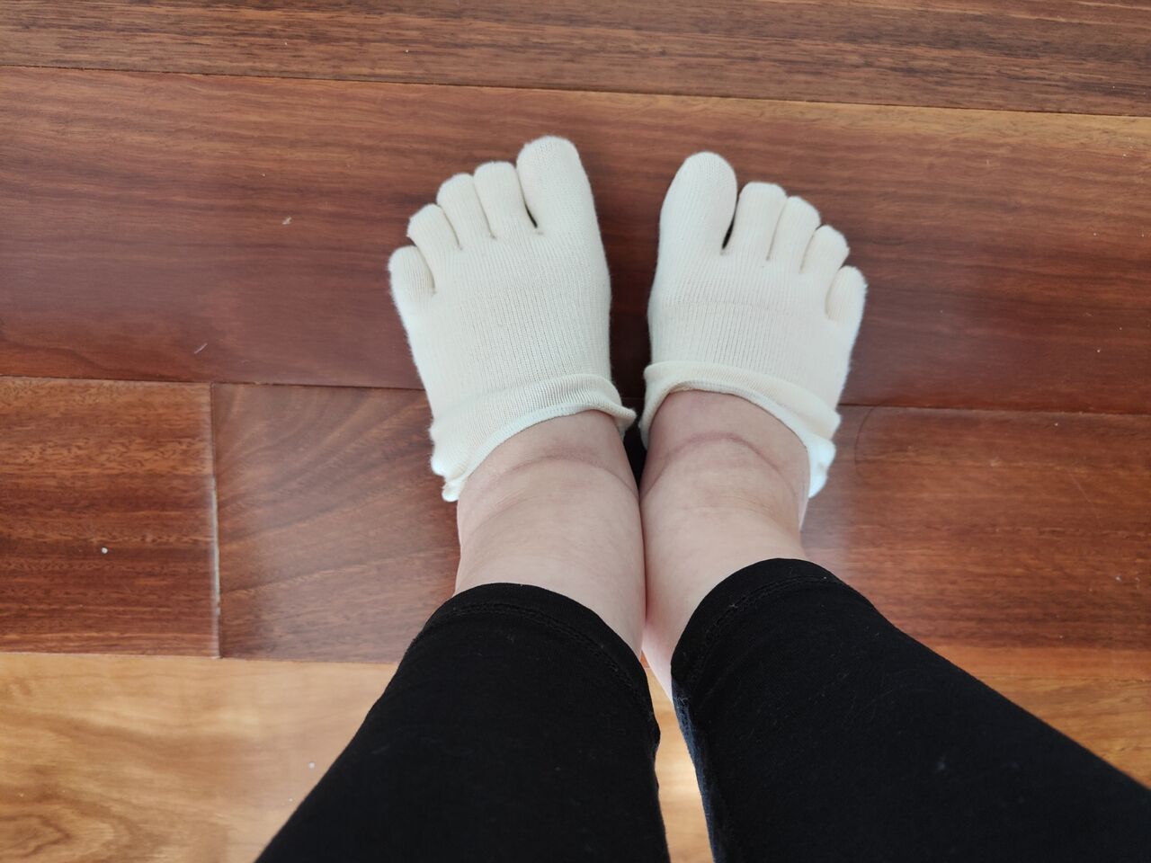 レギンスから出ている足首と靴下の境目がハムみたいになっています。
